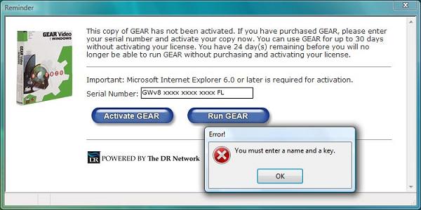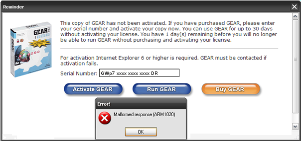 Need a Manual Activation? If you are attempting to activate your copy of GEAR by entering your serial number into the startup splash dialog, you may receive an error message similar to this: